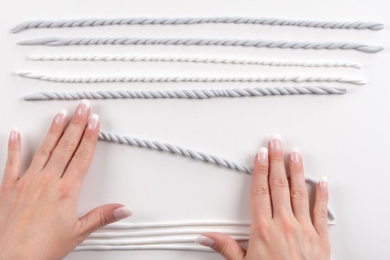 1. Készítsünk mindkét színű gyurmából 12-12 db kb. 3 mm vastag rudat.